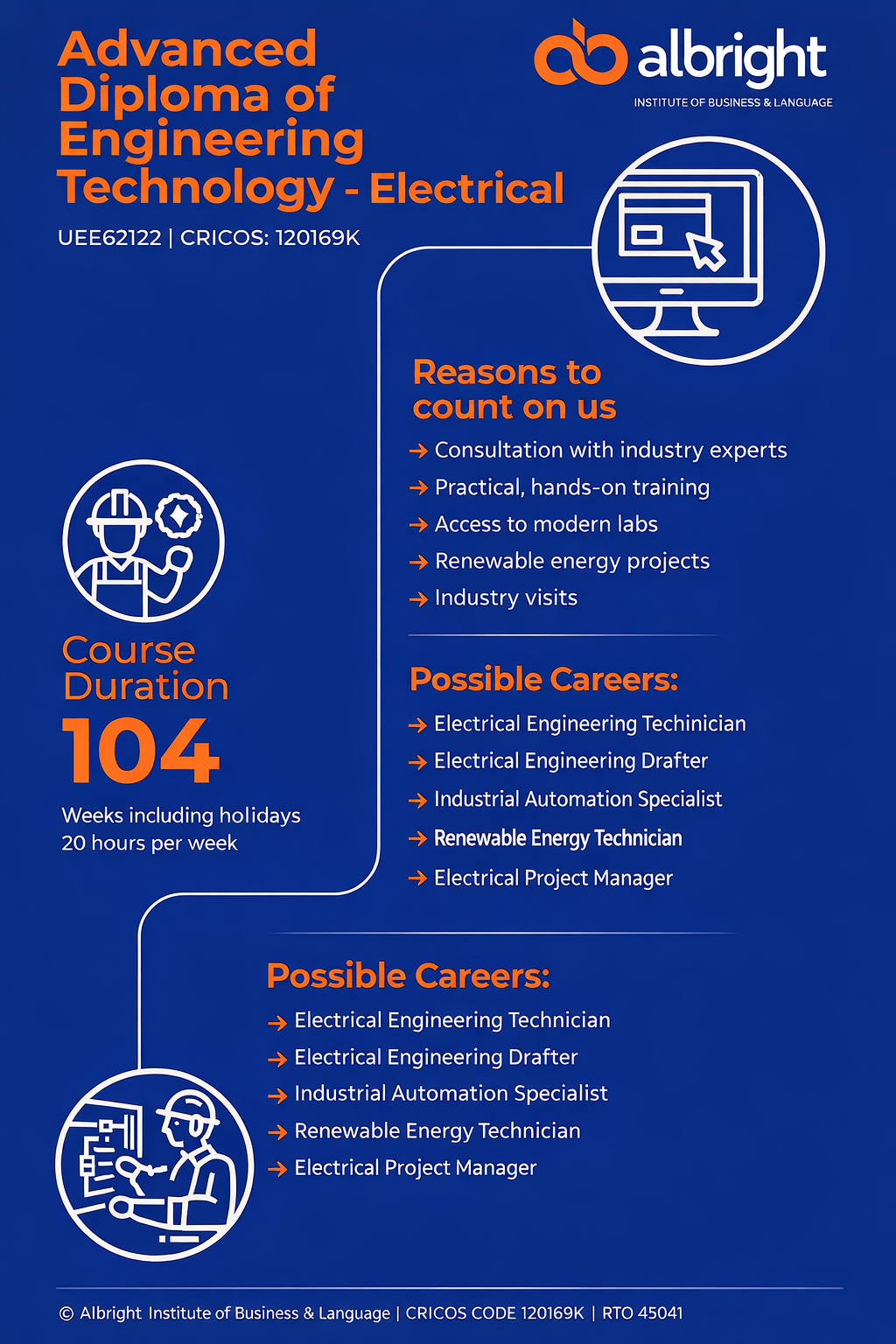The UEE62122 Advanced Diploma of Engineering Technology – Electrical is a nationally recognised qualification in the Australian VET sector. It provides advanced knowledge and practical skills for designing, testing, and managing complex electrical systems.